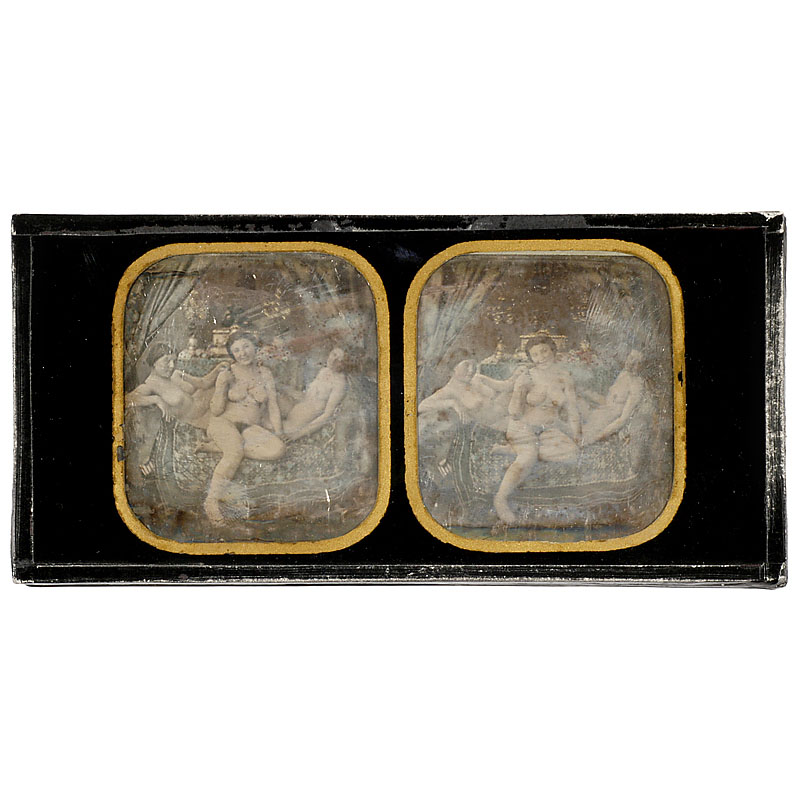 3个年轻少女的裸体照片, 法国制造, 专业的摄影图片, 3个少女坐和半躺在软躺椅上, 规格: 9 x 17 cm (3 1/2 x 6 3/4 in.), 曝光成色很好, 手工着色, 新相框. – 十分罕见的达盖尔式立体裸体照片! – 参考文献: Serge Nazarieff, "Early Erotic Photography" 以及 Orbis Verlag, "Die erotische Daguerreotypie"