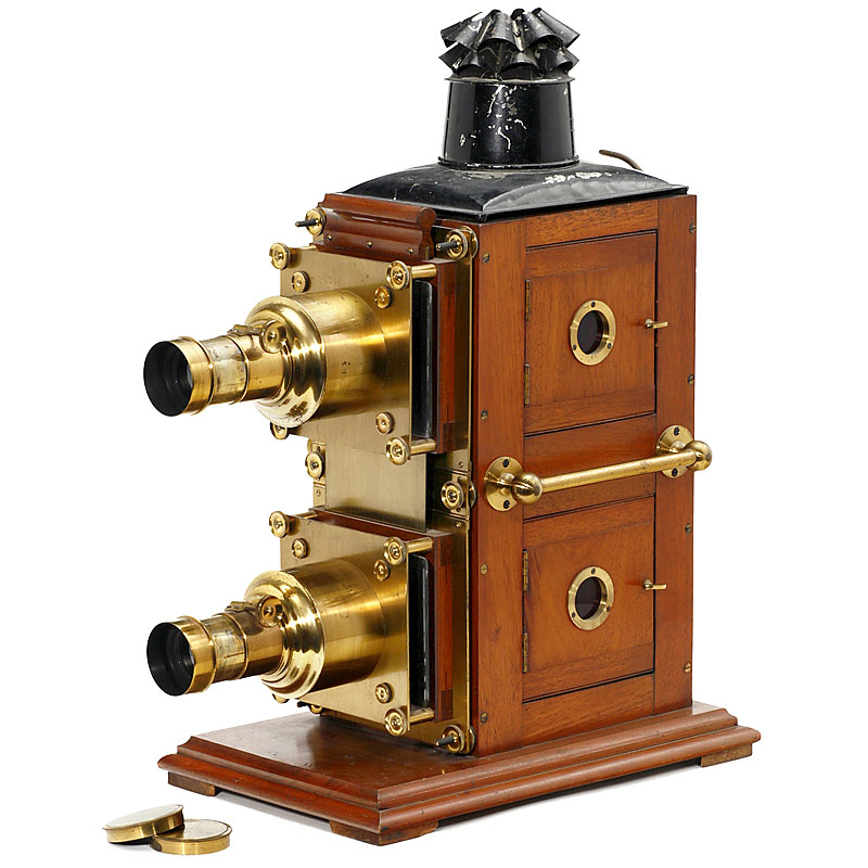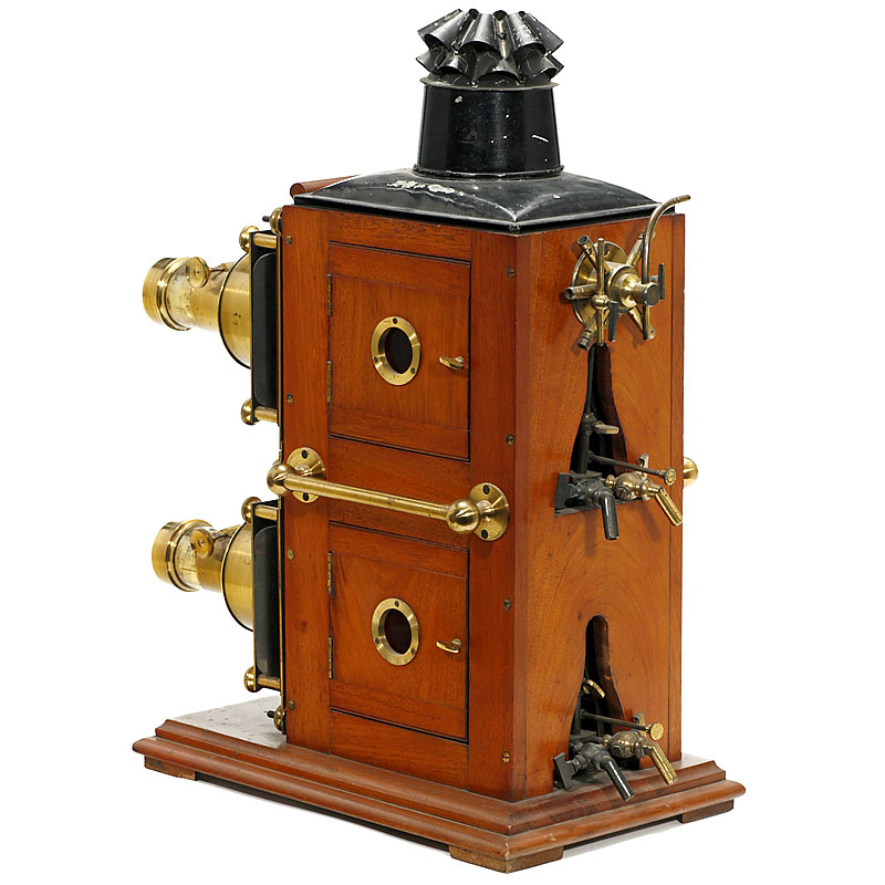 双层魔幻彩灯, 保养得很好. 高 63 cm, 带煤气燃烧器, 用于大的彩灯片, 未标记, 但是可能出自 "W. Watson & Sons", 伦敦, 约1890年. 漆身有轻微破损.