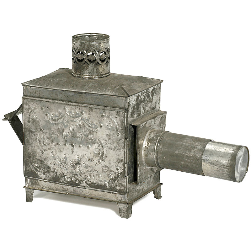 罕见的白铁制作魔幻彩灯, 更为罕见的是其精致的烟囱, 高 9,5 in., 用于 3,2 in. 彩灯片.