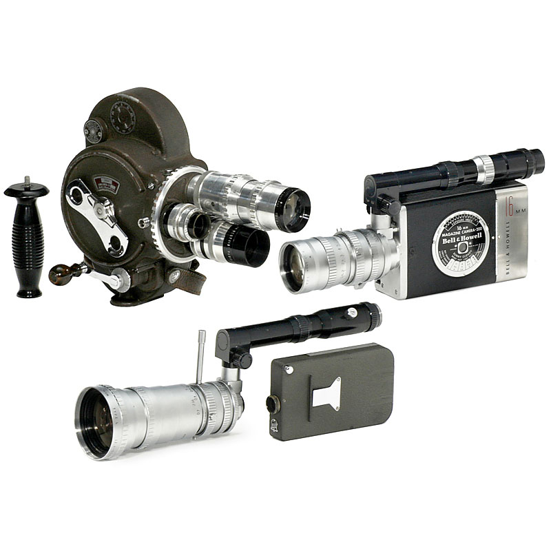 1)Bell & Howell Filmo 70 DL拍品描述: 16mm 电影机, 用于 30 m 胶片 (on daylight loading spool), 发条驱动 8–64 p/s. 3支六角转头镜头(C-mount): Cinor 1,5/25 mm, Tele-Cinor 2,5/75 mm, Tele-Cinor 4,5/145 mm. 联动旋转镜头. 附件: 倒带曲柄, 手柄, 英文版操作说明书以及原装箱子.