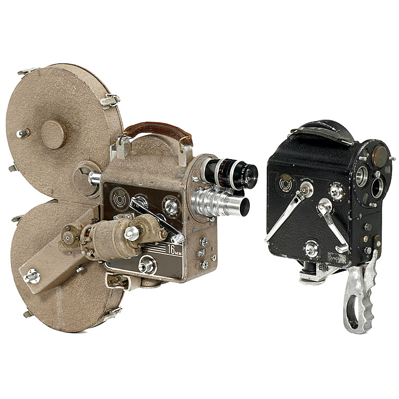 1 ) "ETM P16", 约1947年, 用于 30m 日光卷轴, 发条驱动 16–64 p/s, 牛顿取景器带3支取景器镜头, 六角转头(C-mount), 原装盒子, 曲柄, 手柄