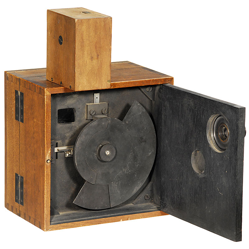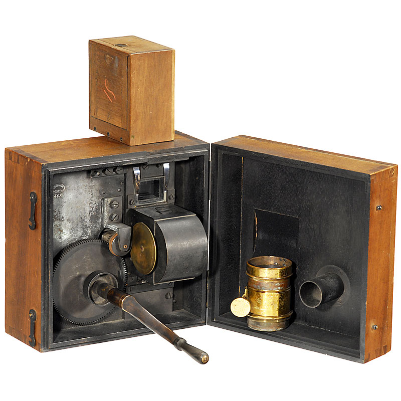 Carpentier, Paris. Early 35mm movie camera for film with Edison perforation, handcrank-operated, mechanism mounted on brass plate, signed: "J. Carpentier, Paris, No. 407", original brass projection lens and camera taking lens. The Cinématographe Lumière was not offered for sale, it was only used by special "Lumière" operators on local shows. – Very rare 35mm movie camera, the classic grandfather of all movie cameras, in top museum quality!