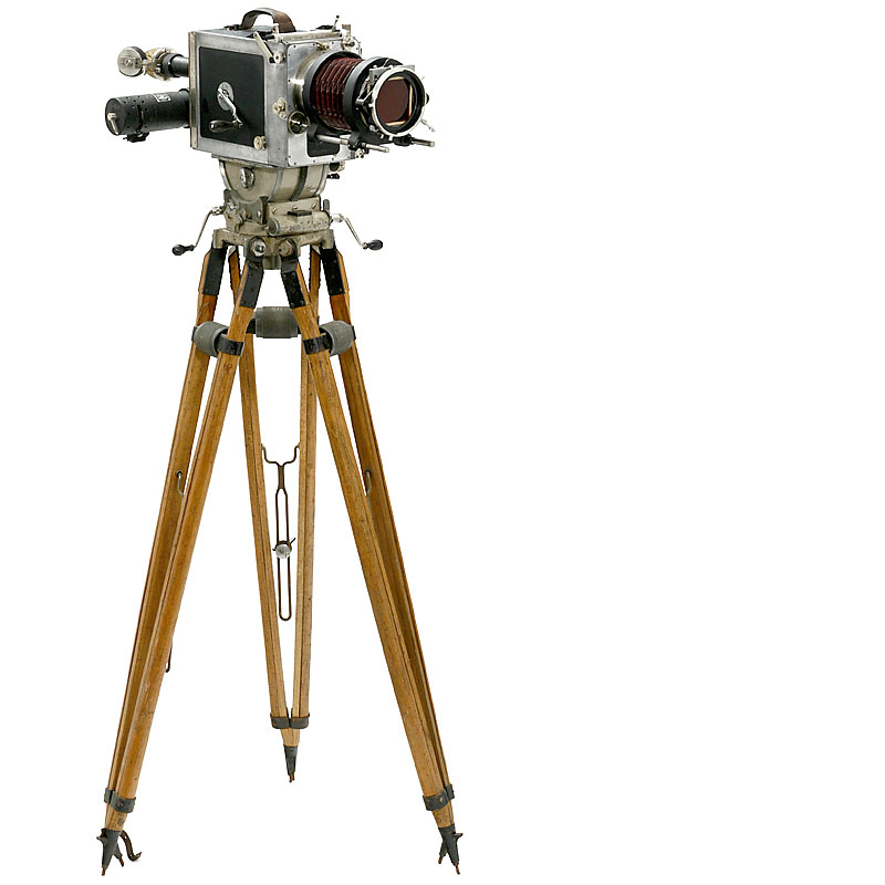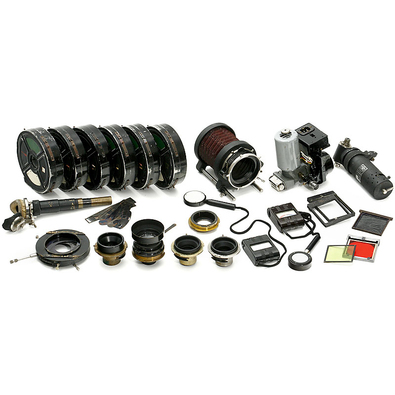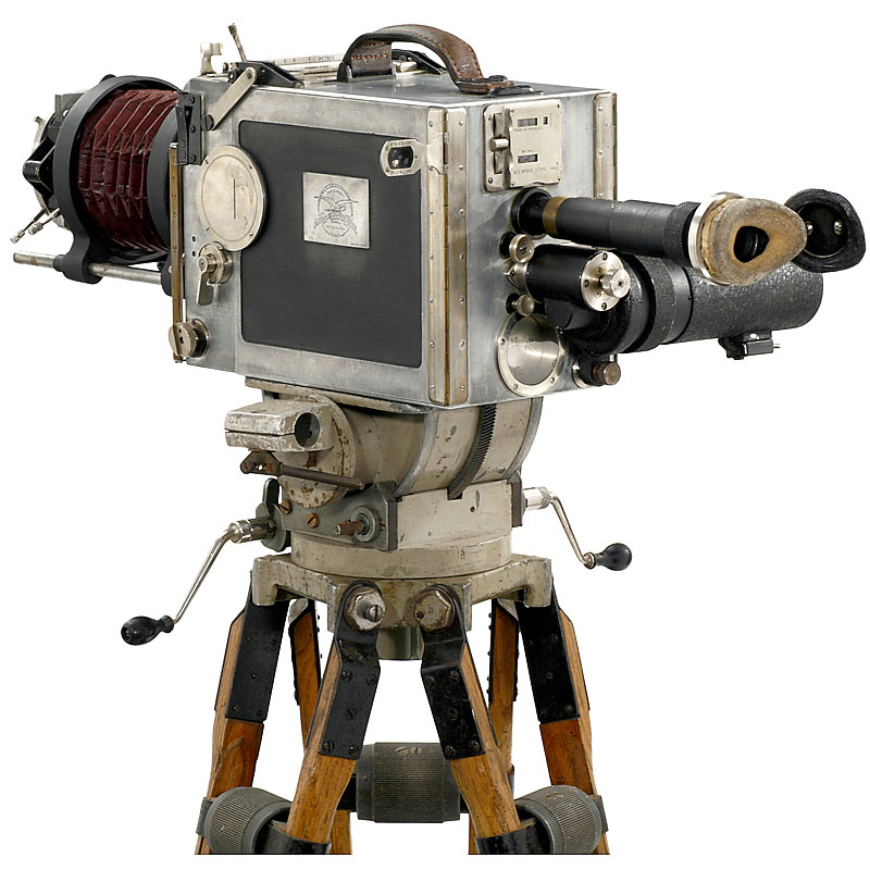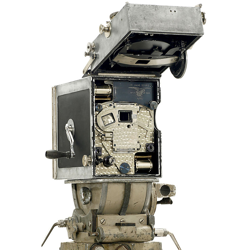 Movie camera "Debrie Le Parvo Mod. L", serial no. 5214, for 35 mm film in 120m cassettes, with "Zeiss Tessar 1:2/40 mm", "Pan-Tachar 1:1,8/25mm", "Sonnar 1:2/50 mm", and "Biotar 1:1,4/70 mm" lenses (and 1 damaged 28mm lens), handcrank or electric motor drive, complete with crank and 2 motors. Accessories: special lens shade with filter holder and filters, iris wipe diaphragm, masks, 6 cassettes, 2 light meters, crank-operated tripod with head.