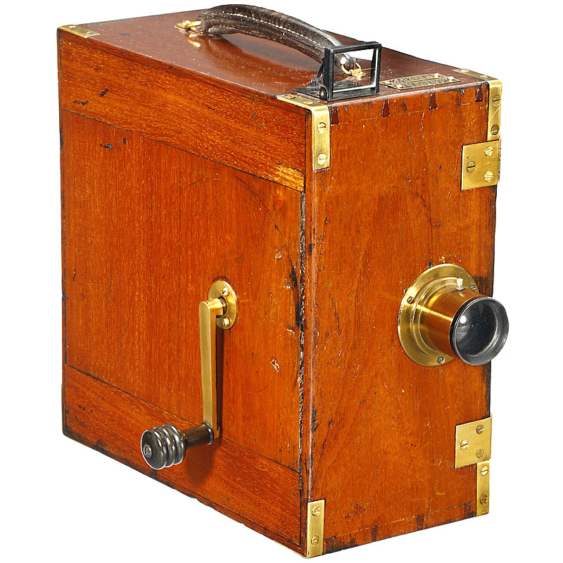 制造商: 可能是 Walturdaw, Cardiff. 35mm 电影机用于30m 胶片, 日光片盒, 手摇柄驱动, 未标记镜头 6/160 mm (不适用于这台相机), 牛顿取景器, 木质机身带黄铜配件. -- 十分引人注意, 受人欢迎!