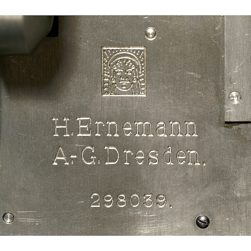 Ernemann A.G., 德雷斯顿. 电影机用于35mm 胶片(放在60m 木制片盒里), 手摇柄驱动, 侧旁有 Metrage 指针, 调焦镜头: Ernon 3,5/50 mm, 内置聚焦毛玻璃取景器, 可调节扇形光圈, 前端有 "H. Ernemann A.-G. Dresden 298039" 雕刻以及公司标志(青春艺术风格的妇女头像), 贵重木质机身. -- 一件出色的收藏!