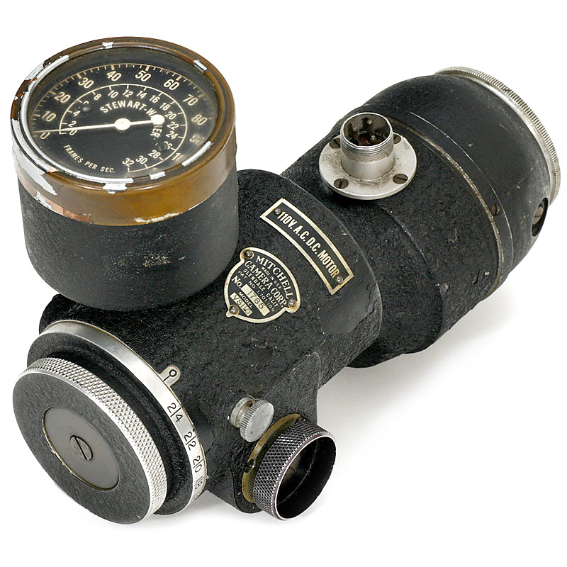 Mitchell, 美国. 35mm 电影机用于300 m胶片(在双片盒里), 手摇柄或低电压马达/发动机驱动, 无紧固/插销装置, 画面窗口带宽银幕避光框, 相机上带有著名的 Mitchell取景器(可卸取), 可供摄影师, 导演, 影片制作者用于题材取景, 这支取景器可用于各种规格画面拍摄, 且焦距可调节. 六角转头可用于4支镜头: Carl Zeiss 2/50 mm, 4,5/50 mm, 2/35 mm, 2/25 mm. -- 附加: 原装 Mitchell 马达/发动机, 无紧固装置!相机放在Mitchell小脚架上, 出自好莱坞电影时期, 十分出众的收藏!电力功能未检测, 照片上面的是导演 Orson Welles 以及 Mitchel 取景器.