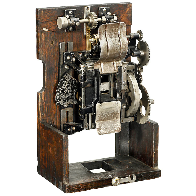 Edison Mfg Orange, USA. Early original Edison projector for 35mm format (introduced by Edison), original brass lens with rack-and-pinion focusing (18 in.), "Edison" and "Thomas A. Edison" label, no. 5682, without handcrank, with original wooden front cap. – A terrific historical milestone and excellent collector's item and museum piece from the beginning of movie history!