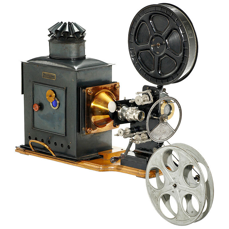 W. Butcher & Sons, Farringdon Avenue, London. Rare and early table cinematograph and projector for slides, for 35mm film on 250m reels (with 2 spools), hand-operated, with 2 lenses for film and slides projection, original gaslighting. Very attractive exhibition piece and desirable collector’s item.