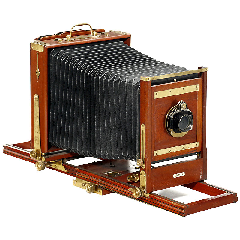 Century Camera Co., Rochester, 美国. 17 x 21 cm, 最小可延长11 cm, 最大可延长67 cm, 前端支架高度可调节, 后背支架可倾斜, 未标记的镜头, Century 快门 1/2-1/100 秒. 贵木质机身带黄铜配件, 毛玻璃后背. -- 罕见!