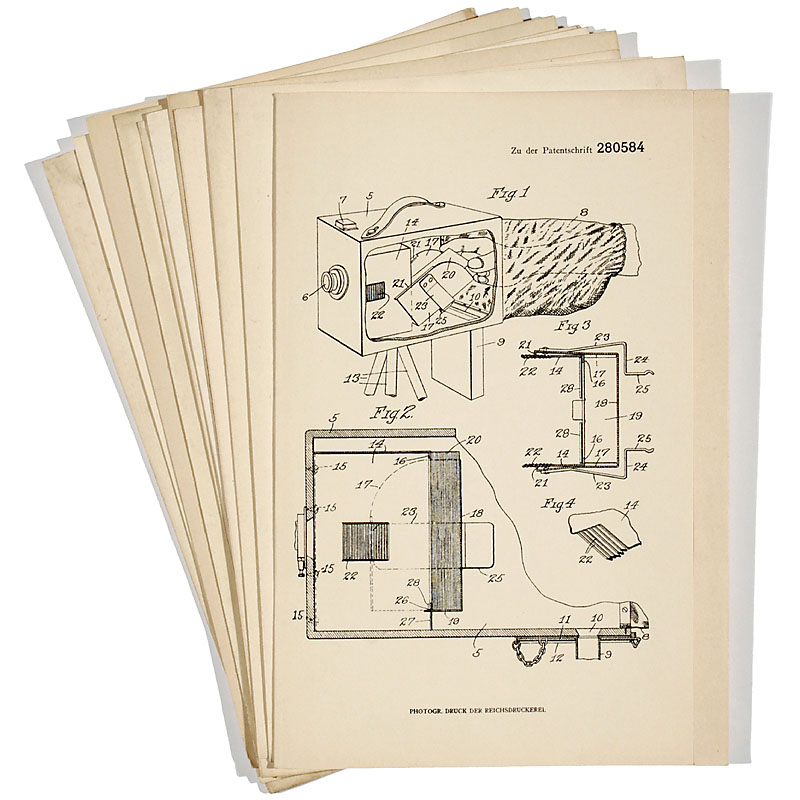 11份专利说明“Kaiserliches Patentamt”, 1881-1913年间, Louis Lumière, Demaria Frères, Carl Paul Stirn, Alfred C. Kemper以及其他. 主题: 片盒相机, 底板转换, 西洋镜等等
