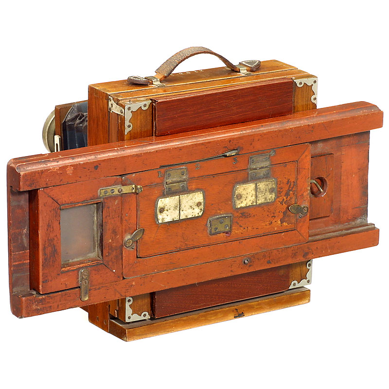 未标记, 可能出自德国旅行相机, 13 x 18 cm, 编号: 21063, 胡桃木质机身, 独特的清绿色皮腔, 红木后背, 十分出众的镜头: Rectilinèaire Extra Rapide, 出自 Otto Perutz, 慕尼黑. no. 13918. -- 对于Agfa相机的收藏爱好者来说, 这是一台倍受欢迎且罕见的相机!