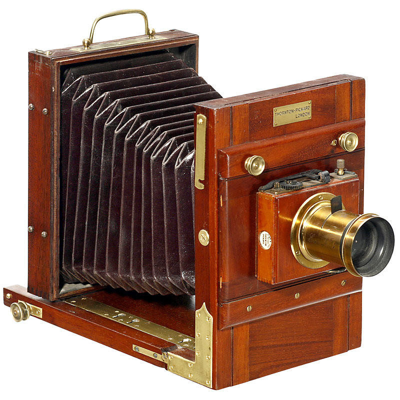 Thornton-Pickard, 伦敦. 保养得很好, 13 x 18 cm, 漂亮的木质机身带黄铜配件, 保养得很好的黄铜镜头, 出自 Derogy, 巴黎, 镜头: Eur. No. 3, 用于插入式光圈, 帘幕式快门, 毛玻璃后背