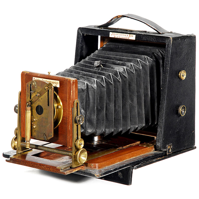 Lancaster & Son, 伯明翰. Folding Instantograph 的小型版本, 用于四分之一片盒(8 x 10 cm), 极其美观和独特的快门“See Saw Shutter”, 出自 Lancaster, 木质机身带黑色皮革覆层和金色装饰/点缀. -- 这台相机同时以“Ladies Camera”而出名.