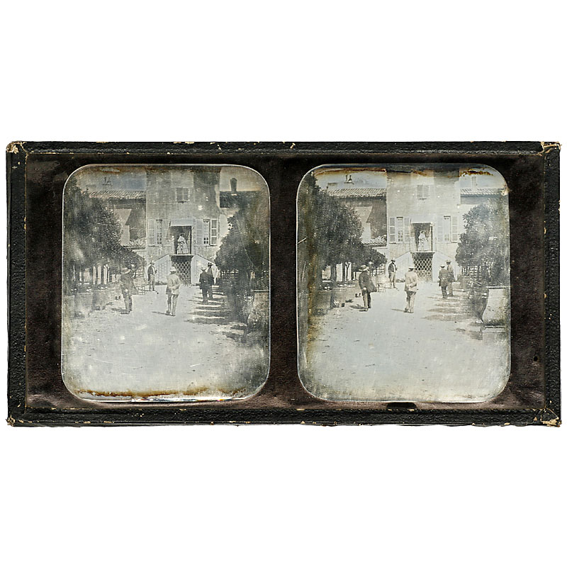 可能出自美国, 原有的照片镶板, 十分罕见的户外摄影, 9 x 17 cm, 照片内容: 6个人在房子前面. -- 保养的极好!