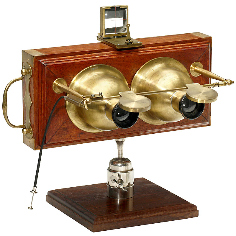 用于底板 6 x 18 cm, 贵木质机身, 2支镜头在黄铜罩盖里, 旋转快门, 牛顿取景器, 贵木质片盒, 黄铜配件, 相机安装在木质底座上, 近代制作. -- 极具收藏价值!