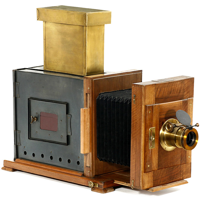 放大型放映机带皮腔装置, 用于 13 x 18 cm 幻灯片, 高度(含烟囱): 53 cm, 长: 46 cm, 镜头带齿轮和驱动调节, 木框, 后安装的烟囱和煤油燃烧器. 成色很好!