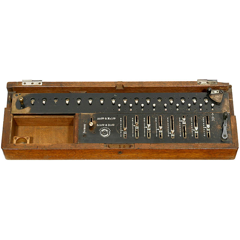 Very first German Thomas-type calculating machine in very good original condition! – With rare clearing system. Serial no.: 4891. Revolution register faulty. – One of the most important collector's items and exhibition pieces in calculating machine history!