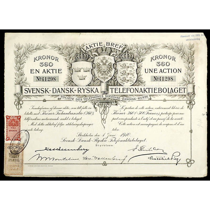 Original handset, wooden case, nickel-plated metal parts. – And: Share of the "Svensk-Dansk-Ryska Telefonaktiebolaget".