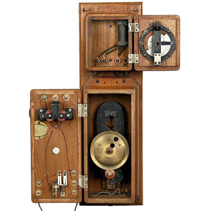 Manufacturer: "Charles Williams Jr., Boston", made for "The National Bell Telephone Co.", two-part walnut case, upper part with microphone, detachable receiver, double bell, complete with all wires and 2 keys. – Excellent unrestored original condition. – Alexander Graham Bell had his laboratory in the same building as Williams; the first Bell telephones were made there under close cooperation between Bell and Williams!
