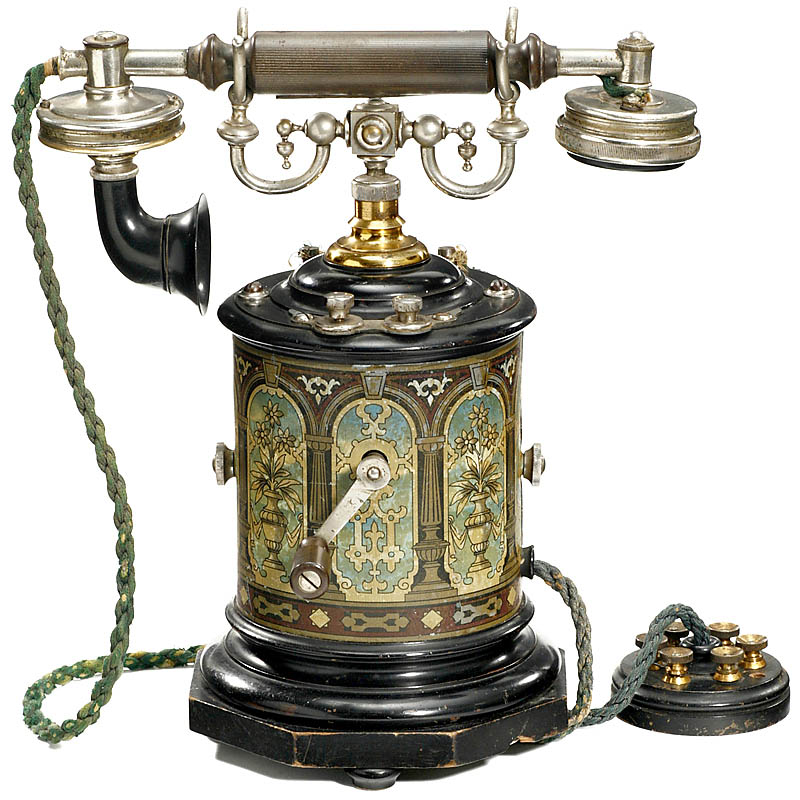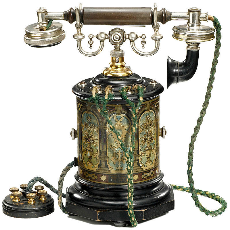 Extremely rare Swedish telephone, with crank inductor, rolled lithographed tin case, on wooden base, with "Ericsson" handset. Export model. – Superb original condition!
