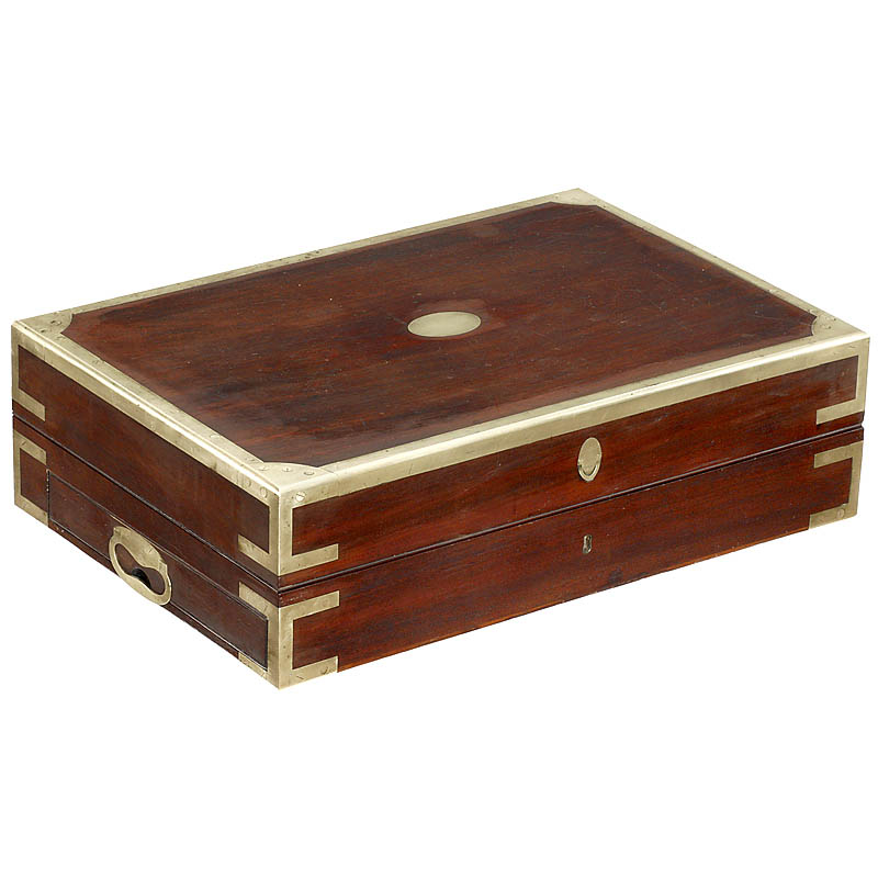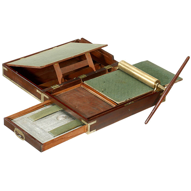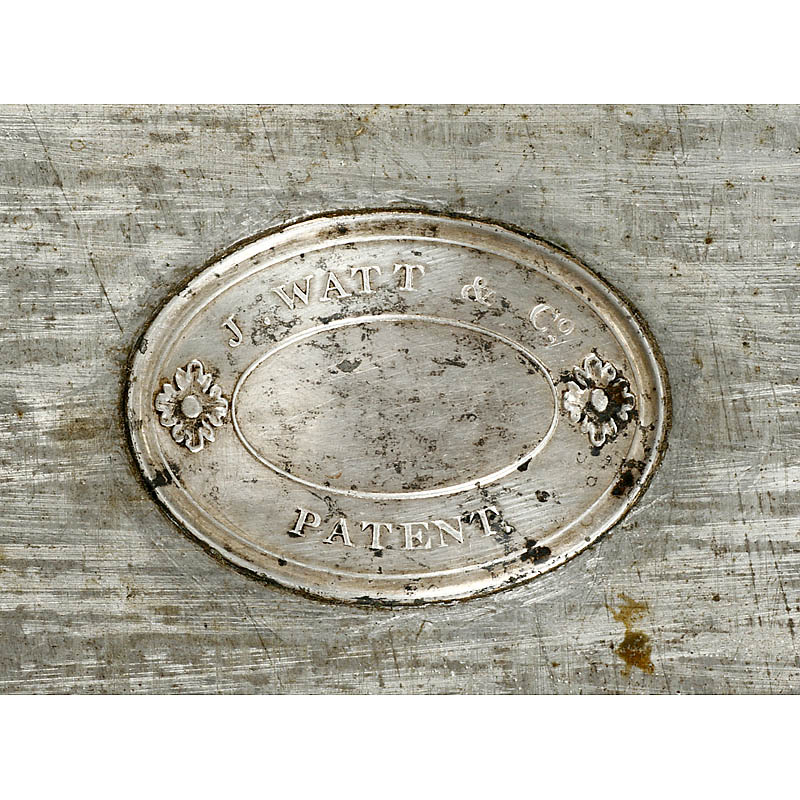 On February 14th, 1780, in England, some 230 years (!) ago, James Watt, the famous inventor of the steam engine, was granted a patent for his first duplicating machine under patent no. 1244. The machine was sold by "James Watt & Company, Soho/Birmingham, England". His invention was a result of his own business as he had permanent correspondence with his partner Matthew Boulton while travelling – mostly to his steam engine projects in Cornwall. And James Watt was too often very frustrated when he received a letter after several weeks with answers by M. Boulton to his written questions because he had no copies of his letters, of course! – So he started developing world's first portable copying press! And by the end of 1780 already 150 machines were sold, and 630 presses by the end of the first full business year! – And it is reported that in the early 1780's Benjamin Franklin, George Washington and Thomas Jefferson used the James Watt copying machine! In 1785 Jefferson was using both the stationary and the portable presses by James Watt & Co. The portable case opened up on hinges, and its upper section contained a collapsible writing pad for preparing the documents. The typewriter had not yet been invented, and copies could be made only of handwritten letters, diagrams and drawings. Underneath the writing pad were compartments for pencils, pens, rulers and paper, as well as a special compartment (the "damping box") which served for treating the copying paper. The metal-coated box was filled with clear well water (3/4 of an ounce) into which 24 sheets of copying paper were placed. A metal-coated lid was placed on top to keep the paper flat. After 12 hours, the sheets were thoroughly moist, and thus treated and ready to be used for copying. The number of sheets required for immediate use could be removed, and the remainder could be left in the box for up to two weeks, ready to be used at any time. The actual copying apparatus, consisting of two brass platens which were turned via the side handle, also located in the bottom section of the case. The original document was placed in the copying plate between the felt-covered, swing-up cover plate; the moist copying paper was placed on top of it, and this was then covered by oilpaper. The pressure by slow turning of the plate between the two platens caused the special copying ink of the original to be taken over, and thus transferred, onto the moist sheet (mirror inverted). The copy was ready for use following 24 hours in a drying book of absorbent paper (as for postage stamps). Because the of absorbent paper (as for postage stamps). Because the ink was passed through in this manner, the printing on the copy could, of course, be read only on what was actually the reverse side of the page. The basis for good copies was the special copying ink in which the original was written. A great deal of practice was also necessary to prepare sheets for use as copying paper, as they had to be absolutely uniformly moistened. The bottom part of the case also contained inkwells as well as containers of dry ink powder for making ink when travelling.