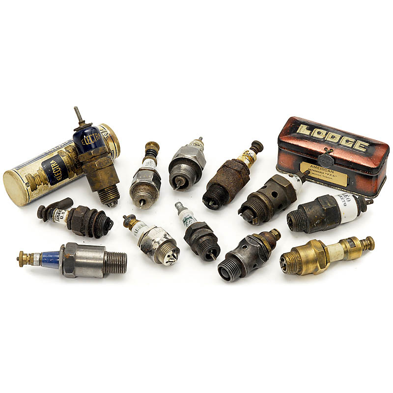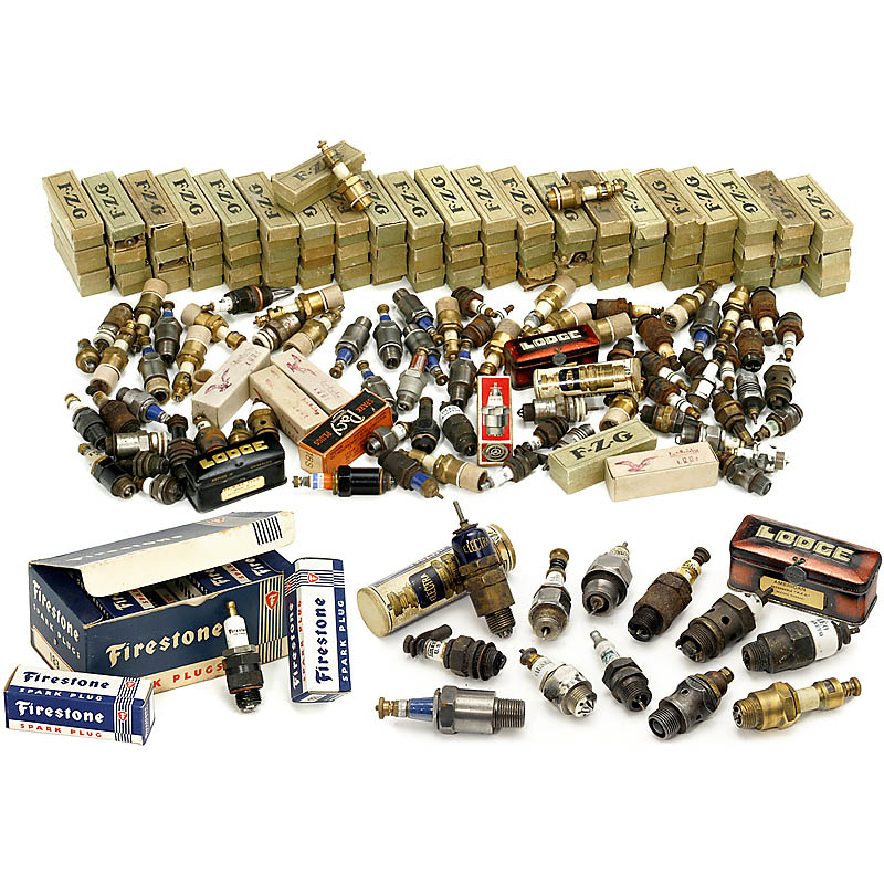 More than 100 in unused condition, partly originally boxed, European and American manufacturers, among to other "Edison", "Lodge", "Bosch", "Molla", "Eyquem Nationale", "Champion". – Add-on: Spark plug collector's guide.
