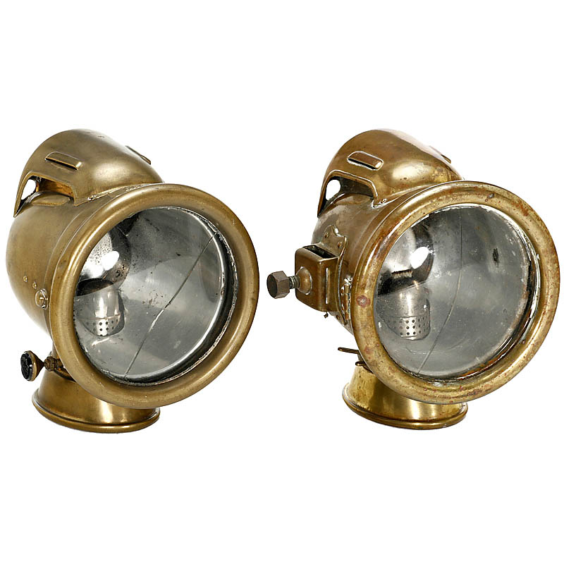 Brass-made side lamps, manufactured by: Hugo Schneider, Leipzig, for petroleum, height each 6 3/4 in., minor dents, broken glasses.