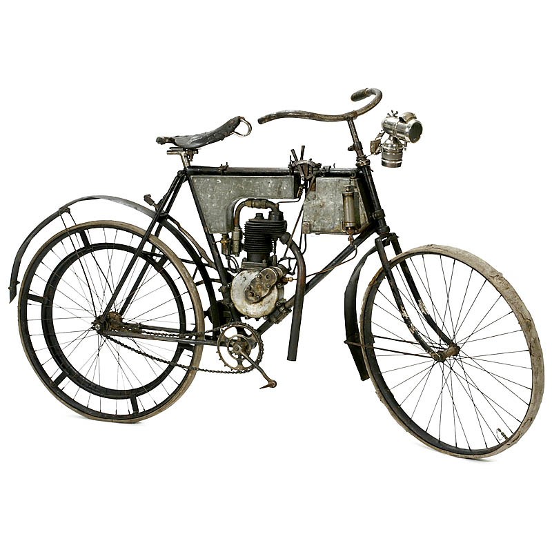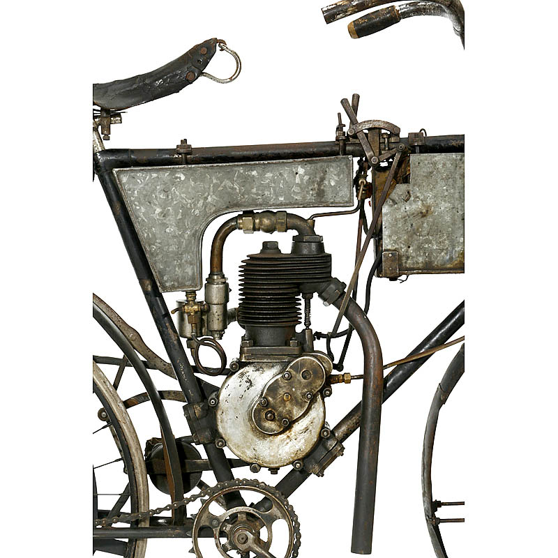 Unmarked, probably manufactured by "Minerva, Anvers", single-cylinder motor, drive with pulleys and belt, also with paddles and chain, carbide lamp. Engine turns freely! Barn find in unrestored original condition!