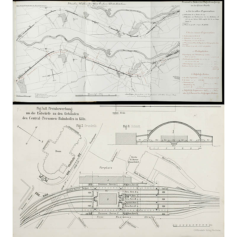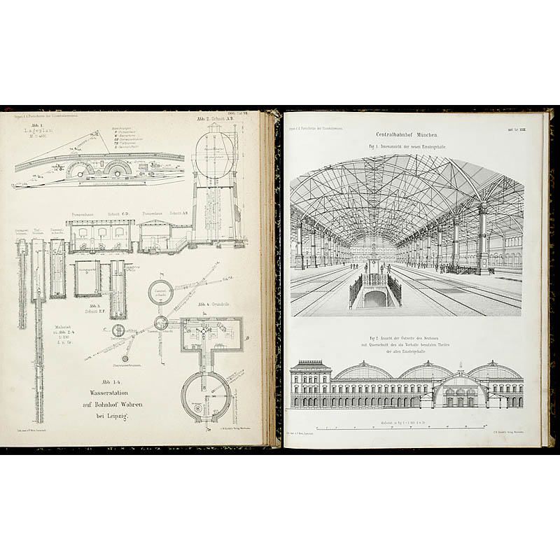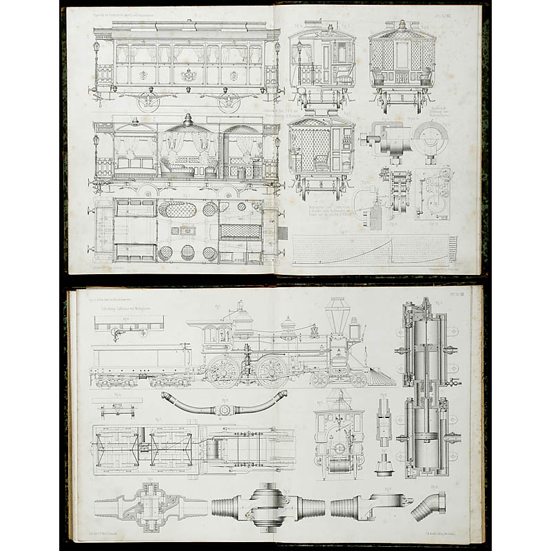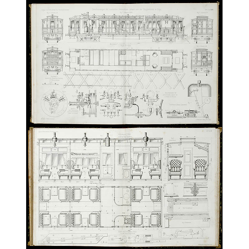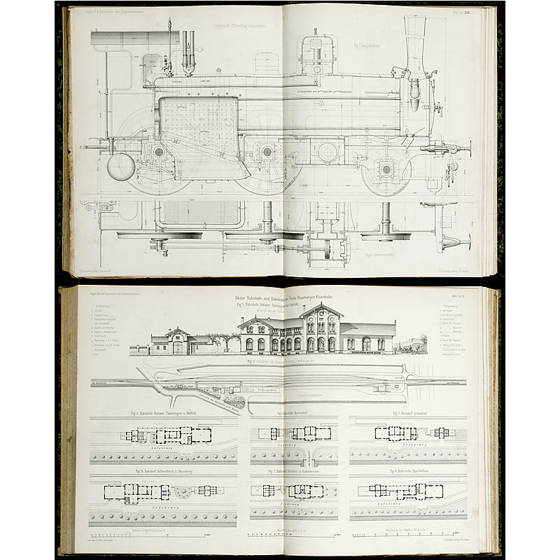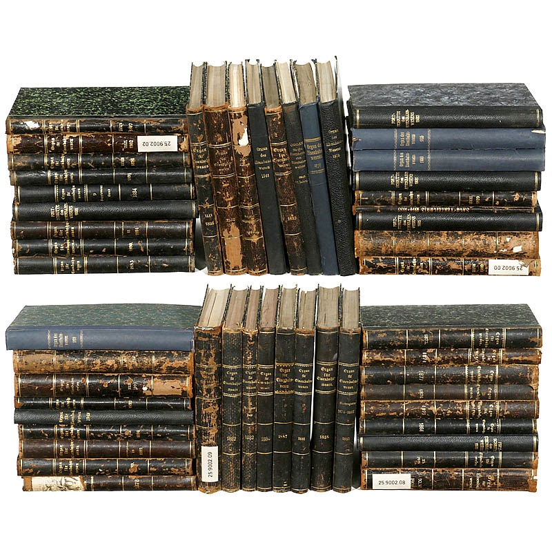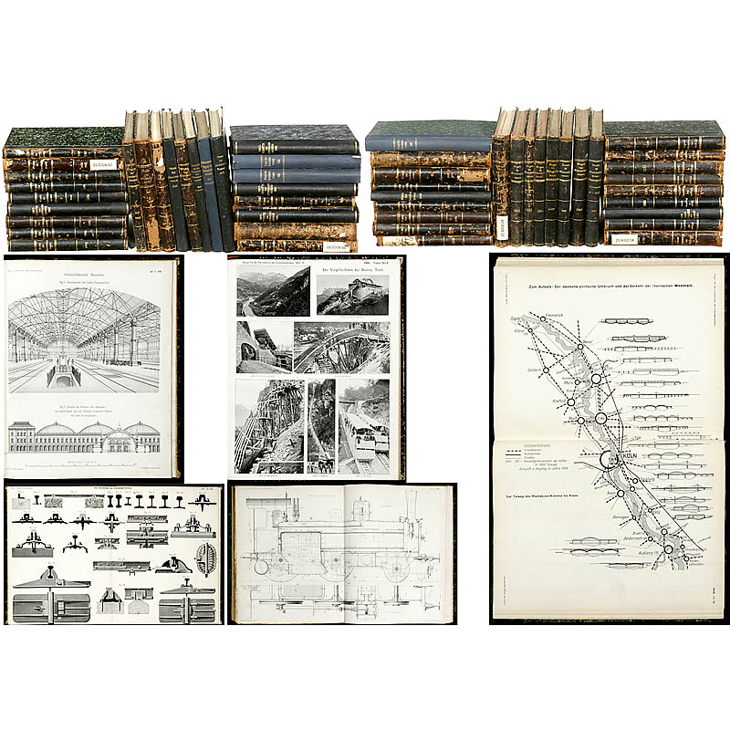 57 bound volumes and 5 bound lists of contents of the German magazine "Organ für die Fortschritte des Eisenbahnwesens in technischer Beziehung", size 10 x 11 3/4 in., embossed leather backs, about 18,000 pages with numerous drawings, pictures and advertisings. With following volumes: 1873–1878, 1880–1882 (with supplementary volume), 1883–1884 (with supplementary volume), 1885, 1887–1893 (with suplementary volume), 1894 (with supplementary volume), 1896–1911, 1925–1936, 1938, 1940–1942.