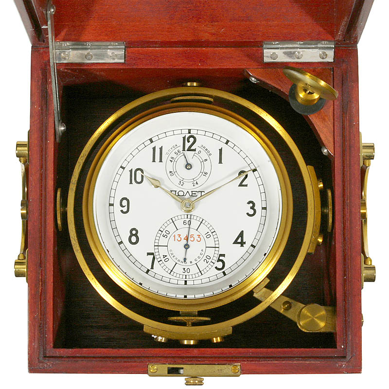 Manufacturer: Polet, USSR, serial no. 13453, three-tier mahogany case with brass fittings, in outer mahogany case, with 2nd dial and up-and-down dial calibrated for 56 hours. – Running.
