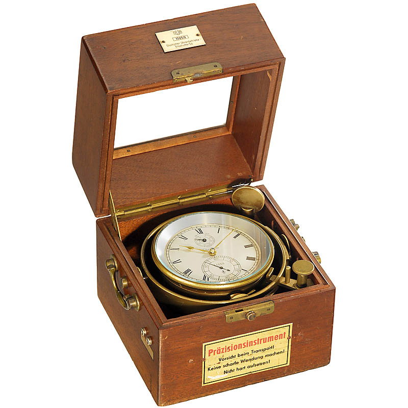 Manufacturer: "GUB Glashütter Uhrenbetriebe. Glashütte", Saxony, Germany. Serial no. 11059, in brass bowl case gimbal, in fitted two-tier mahogany box, with seconds dial and up-and-down dial for 60 hours, with key. Working! The company "GUB" was the direct successor to A. Lange & Sohne.