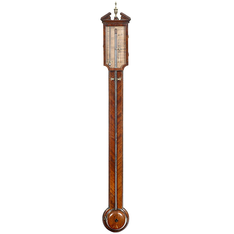 With hand-punched boxwood register signed"D. Manticha, Norwich", brass sliding scale, thermometer and mercury tubes, inlaid borders and pediment with brass finish, height 40 in. (102 cm), tube replaced.