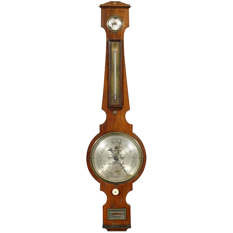 Signed on silvered scale "T. Fovoley & Co., Stockport", with mercury thermometer, hygrometer and level, height 38 in.