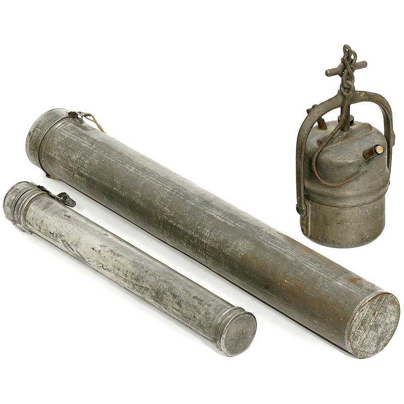 1) Miner's lamp (carbide), useable for ore-, slate- and salt-mining.