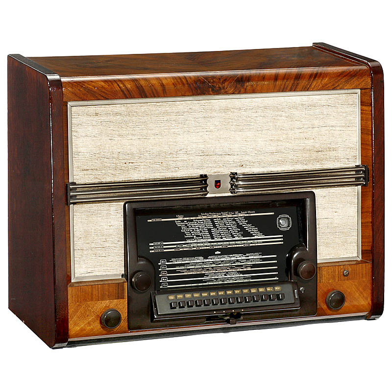8-valve superhet receiver, all-wave ranges, magic eye, tuning with motor, 10-station memory, costly construction, cloth renewed, case restored. A top class radio!