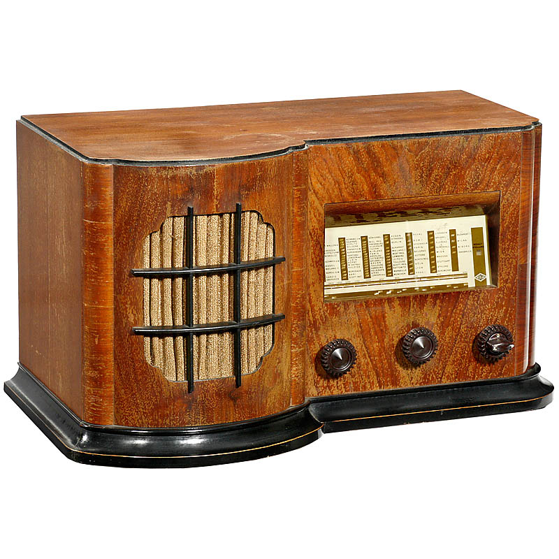 5-valve receiver, mains-powered, 3 wave ranges, scale and cloth original, varnish with minor cracks. A sought-after collector's item.