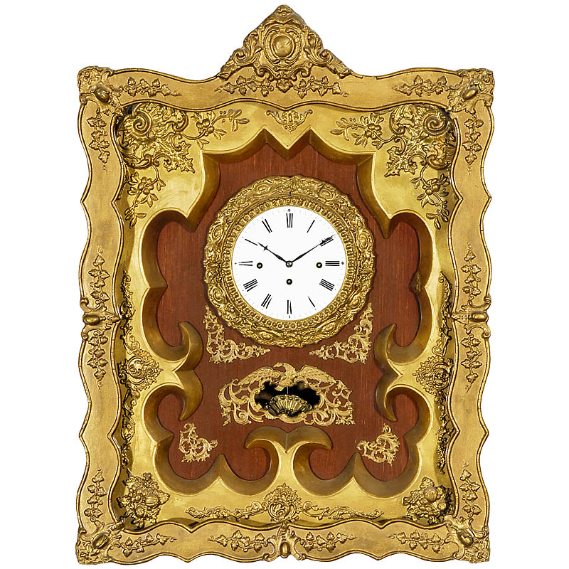 Gilded wooden case, glazed door, enameled dial, brass platinum mechanism, sun pendulum, ¼-hour strike on chime springs, cylinder movement with 2 airs, marked "A. Olbrich in Wien", releasing every hour, size 19 x 25 ½ x 6 ¾ in., working!