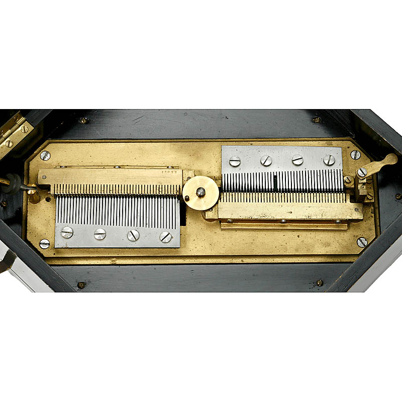 Manufacturer: Symphonion Musikwerke, Leipzig. For 10 5/8 in. discs, 84 teeth in double comb (1 tooth broken), good playing condition, with 16 discs!