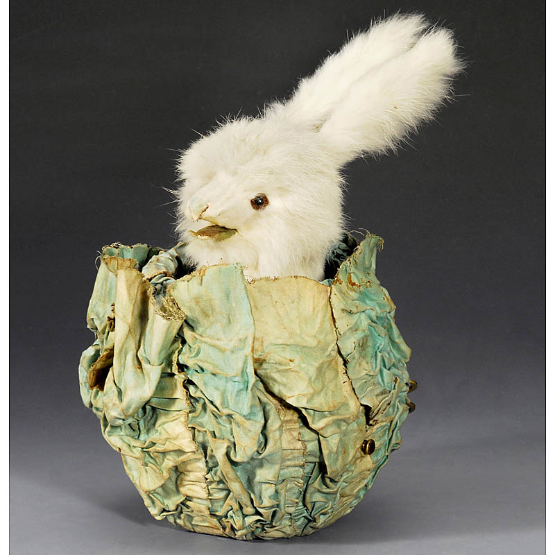 With white fur-covered body, articulated ears and mouth, in papier-mâché cabbage with crimped fabric leaves, stop/start and open-spring motor playing a single tune as rabbit rises, pricks up his ears, chews a piece of lettuce and then retreats, height 8 ½ in. (21 cm) extended, in rare original cardboard box with part of label "Dutzd. No. 1004, Made in Austria" (box worn). – An amusing automaton in working order.