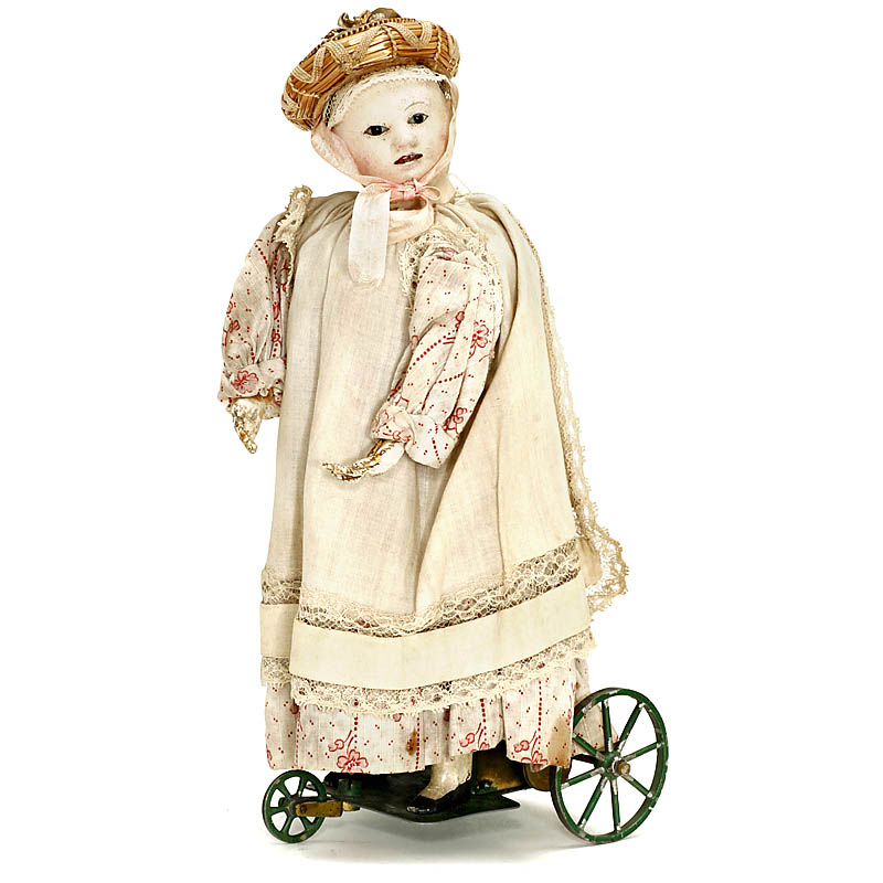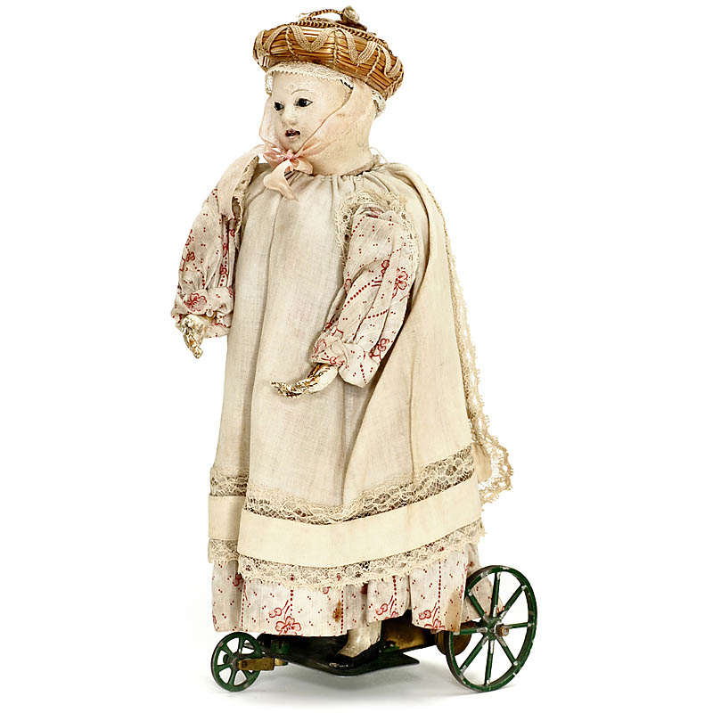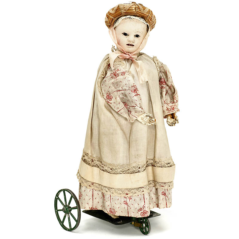 Child with papier-mâché head, black glass eyes, open mouth with four bamboo teeth, painted black hair accented with brushstrokes, kid arms, green-painted metal platform with 1 7/8 in. spoked back wheels and 7/8 in. offcentre front wheel, going-barrel motor and two cranks that cause figure to move in a circle, turn her head and raise her right arm, in cotton print dress, lace-edged apron and straw bourrelet cap, height 9 ½ in. (24 cm), original paint, retouch left temple, some surface cracks. In good working condition.