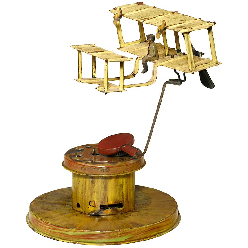 Biplane with pilot, hand-japanned tin, on base containing the clockwork mechanism, working.