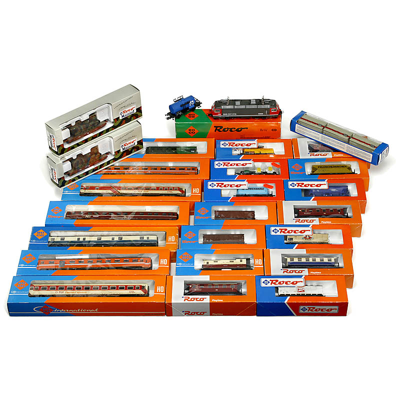 Electric locomotive RE 4/4 of the SBB, AC, no. 43921; 10 freight wagons; 2 flat cars with Leopard tanks (limited edition); 1 box with 3 containers; 6 short passenger cars; 6 long passenger cars. – All (except of Aral tank wagon) originally boxed, nearly new condition.