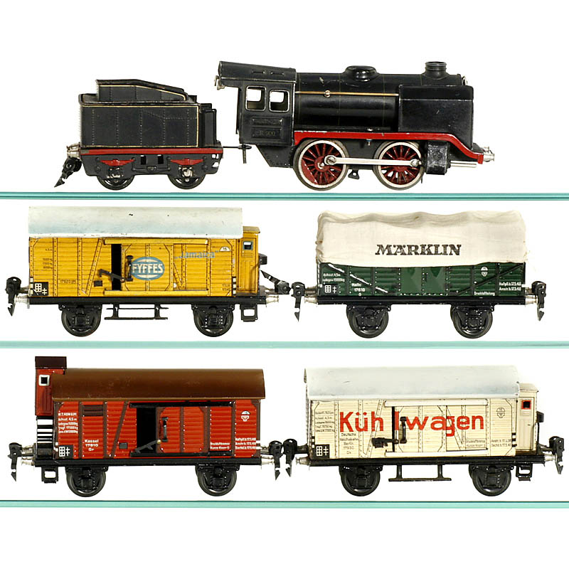 Locomotive with tender no. R 900, clockwork (working); banana wagon no. 1792; refrigerator wagon no. 1793; closed goods wagon no. 1791 and covered goods wagon no. 1761.