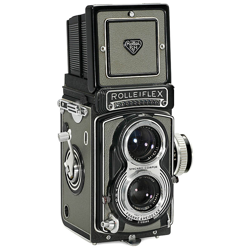 Franke & Heidecke, Braunschweig. No. T 2108086, with grey leather, Tessar 3,5/75 mm in Synchro-Compur, first one-size back plate, built-in light meter (working). In excellent condition.