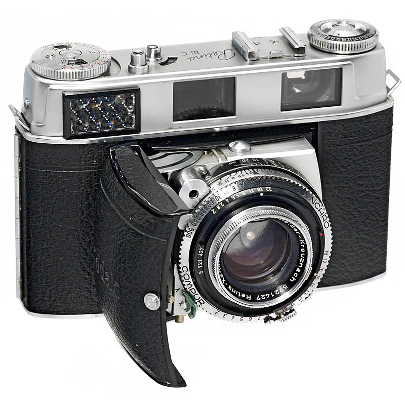 Kodak AG, Stuttgart. No. 78695, Xenon C 2/50 mm in Synchro-Compur. The top model of the legendary Retina folding rangefinder series. Bright line finder for 3 interchangeable lenses, selenium meter range 5–1300 ASA. Exceptional condition, really mint, like new!