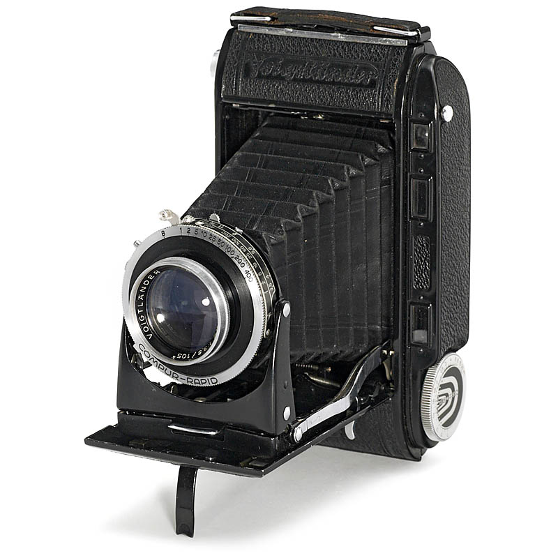 Voigtländer, Braunschweig. Final production of the Bessa RF, with Color-Heliar 3.5/105 mm in Compur-Rapid 1–1/400 sec., synchronized, leather covering, mint condition with 4.5x6cm mask. Very rare!